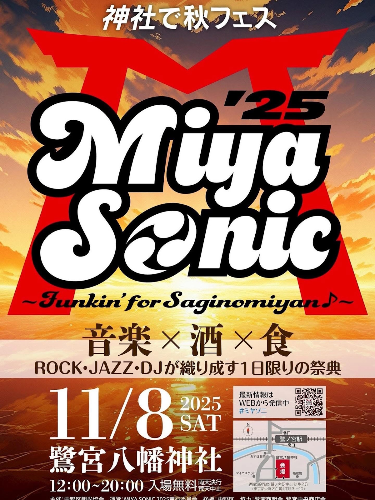 神社境内で「音楽×酒×食」を楽しむ「MIYA SONIC(宮ソニック)2025」が11月8日、西武新宿線「鷺ノ宮駅」南側に位置する鷺宮八幡神社(中野区白鷺1)で開催される。