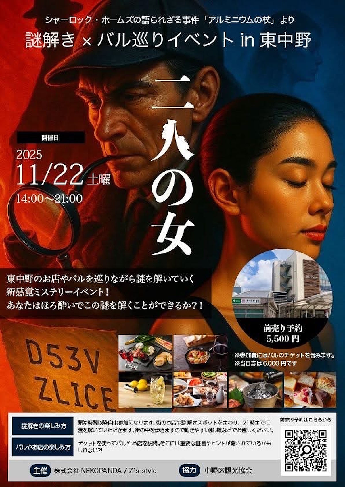 街を楽しみながら謎解きを進める参加型リアル謎解きイベント「二人の女」が11月22日、JR東中野駅周辺で開催される。
