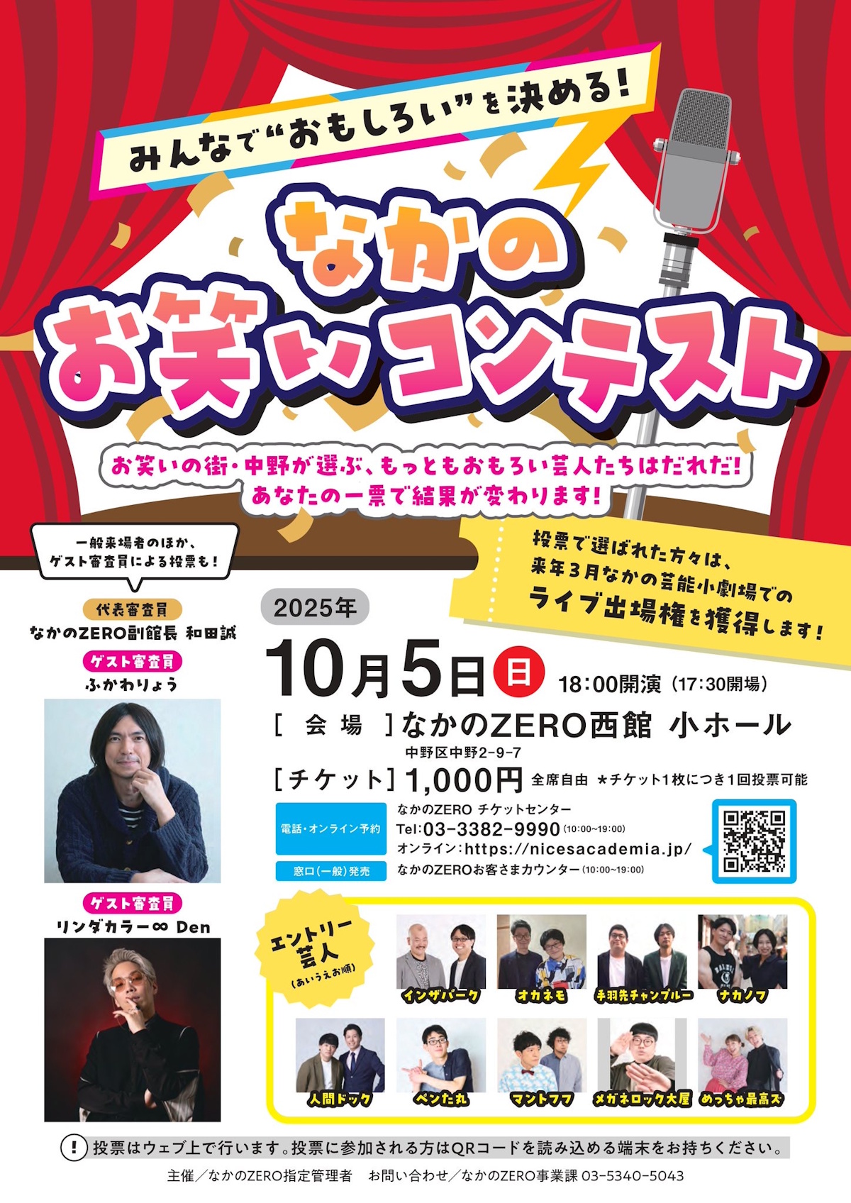 お笑い芸人の街・中野が選ぶ最も「面白い」芸人を選ぶ同イベント。エントリーした「インザパーク」「オカネモ」「手羽先チャンプルー」「ナカノフ」「人間ドック」「マントフフ」「メガネロック大屋」「めっちゃ最高ズ」(五十音順)の8組のお笑い芸人がお笑いを披露し、観客によるウェブ投票で「面白い」ナンバーワンを決める。代表審査員は同館副館長の和田誠さん、お笑い芸人ふかわりょうさん、お笑いトリオ「リンダカラー∞(リンダカラーインフィニティ)」Denさんが審査員を務める。