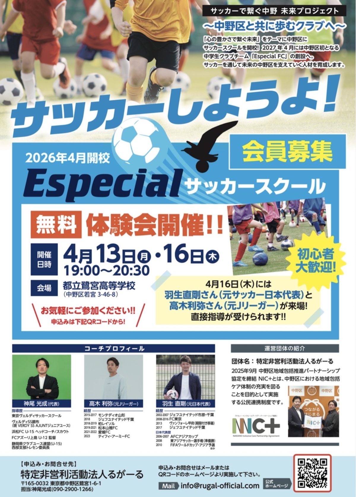 NPO法人「るがーる」(中野区鷺宮1)は4月13日と16日、都立鷺宮高校(若宮3)で「Especial(エスペシアル)サッカースクール」会員募集に関連した体験会を開催する。