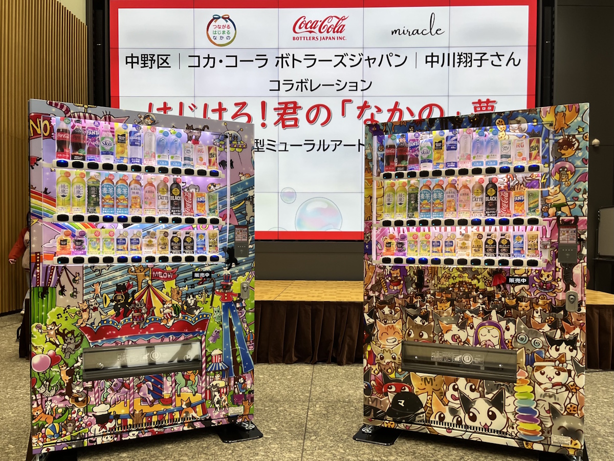 コカ・コーラ ボトラーズジャパン(港区、以下コカ・コーラ社)と中野区が連携して中川翔子さん(ミラクル所属)がデザインを担当したミューラルアート自動販売機のお披露目イベントが3月25日、中野区役所1階「ナカノバ」で行われた。