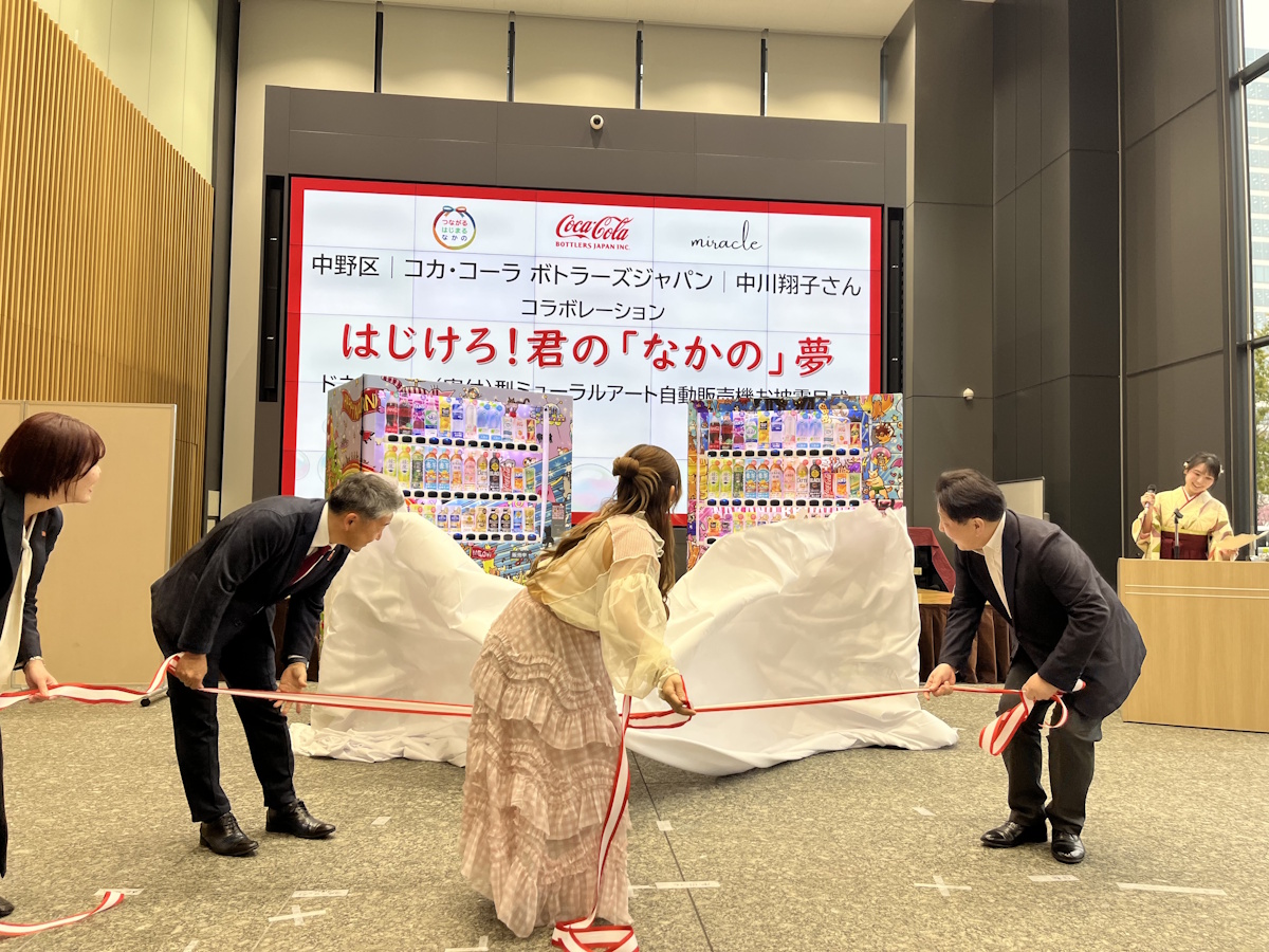 コカ・コーラ ボトラーズジャパン(港区、以下コカ・コーラ社)と中野区が連携して中川翔子さん(ミラクル所属)がデザインを担当したミューラルアート自動販売機のお披露目イベントが3月25日、中野区役所1階「ナカノバ」で行われた。