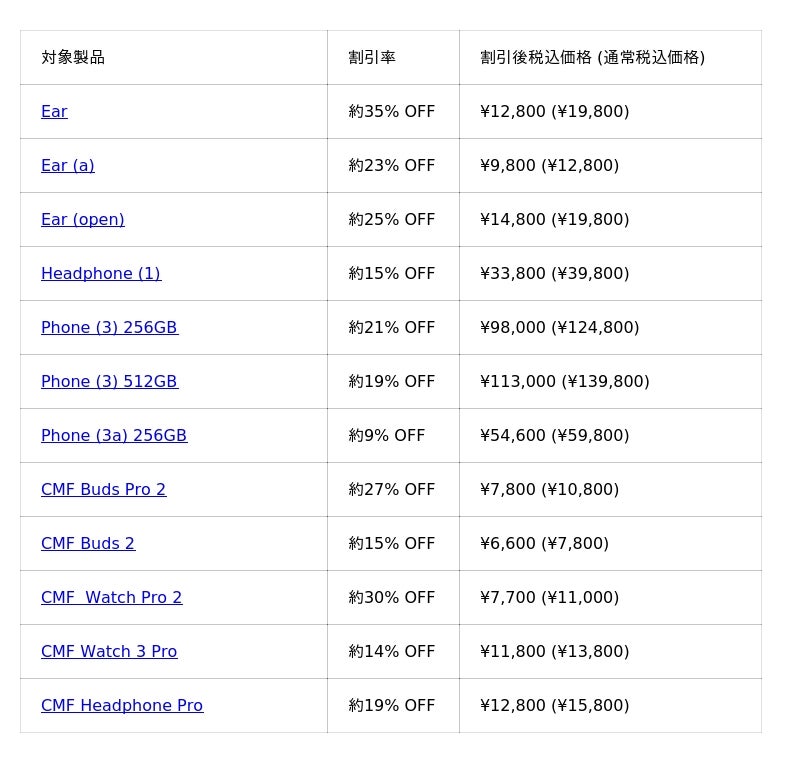 今年のセールでは、Nothing Phone (3) が26,800円オフの特別価格で登場。さらに、Nothing Earを過去最もお得に手に入れられるチャンスに加え、人気のオーディオ製品を含む対象アイテムが最大35%オフとなる特別セールを実施します。