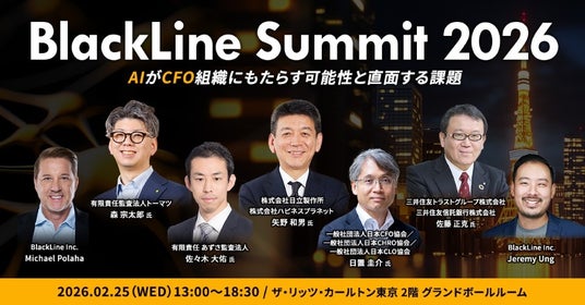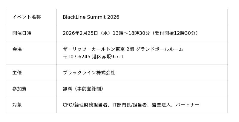 クラウド型経理業務変革プラットフォームを提供するブラックライン株式会社(日本法人:東京都港区、代表取締役社長:宮崎盛光、以下「ブラックライン」)は、CFOおよび経理財務部門の方々を対象とした年次イベント 「BlackLine Summit 2026」 を、2026年2月25日(水)にザ・リッツ・カールトン東京にて開催します。